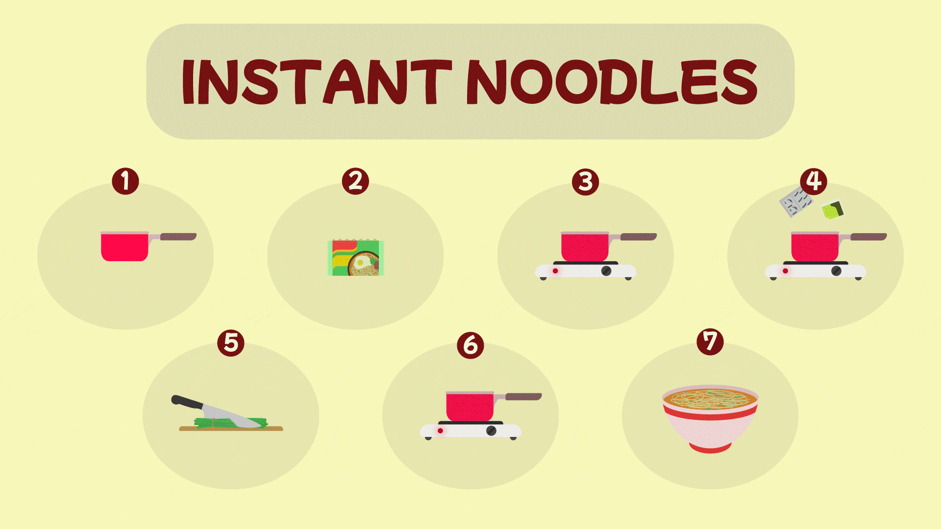 In mijn eigen project heb ik een stapsgewijze animatie gemaakt zonder tekst, waarin ik laat zien hoe je instant noodles bereidt. De visuele stappen maken het bereidingsproces helder en toegankelijk.